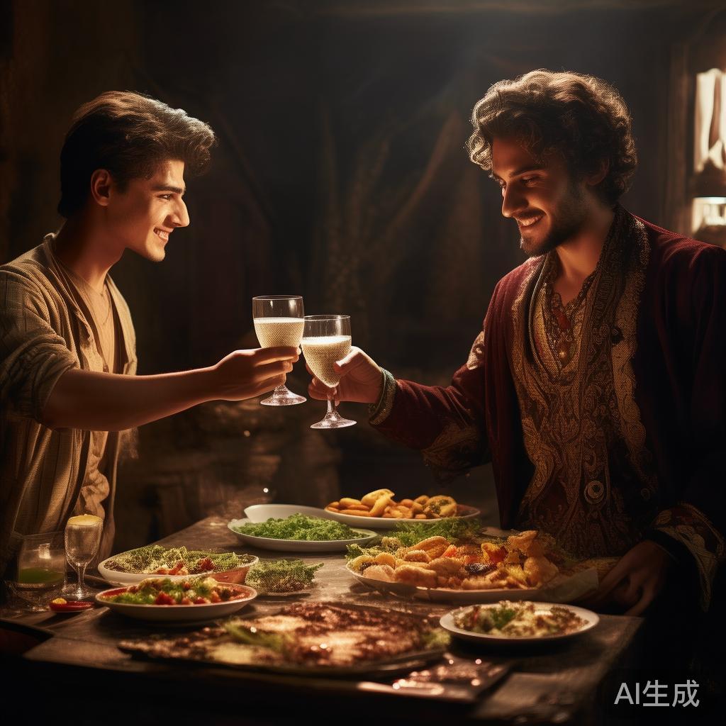 喏,到了家里,哈桑给国王摆酒设菜,两个人畅快地干杯聊天。国王觉得这个小子挺特别,不由问起他的身份。哈桑神秘地回答:“朋友,过去的事情就让它过去吧,咱今儿晚上开心就好!”