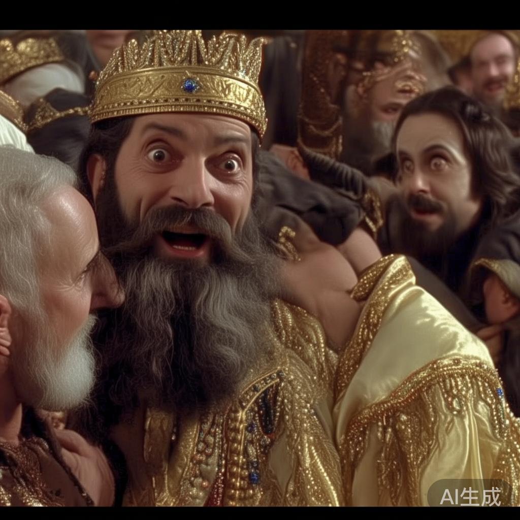 接着国王赫鲁纳·拉德成了笑柄,更搞笑的是,王后也被卷了进来。在这个巨大的乌龙中,大家本以为有人真的丧命,最后竟是哈桑和老婆自编自演的一场戏。真是一场脑洞大开的启示,谁能想到这里头的一出好戏瞎折腾还能赚两千金币呢?
