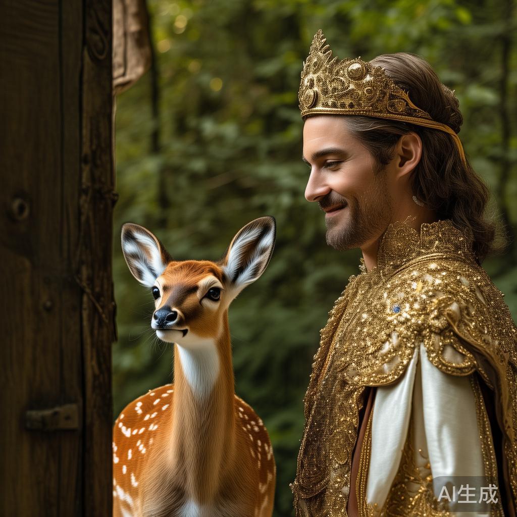 国王瞧见美丽的小鹿,转身对那个猎人说道:“带我去那座小屋。”来至小屋前,他轻敲门道:“我的小姐姐,让我进去吧!”随着门的开启,国王走入其中,并发现屋内是他见过最美丽的女子。就在这时,假冒的王后竟坐在那里,心生恐慌,不过国王和善地望着她,伸出温暖的手说:“愿意和我一起回宫,成为我的妻子吗?” “当然”,姑娘应允道,“但小鹿也得与我同行。我无法和它分开。”国王微笑答应:“小鹿会伴你身旁,一切皆会如愿。”