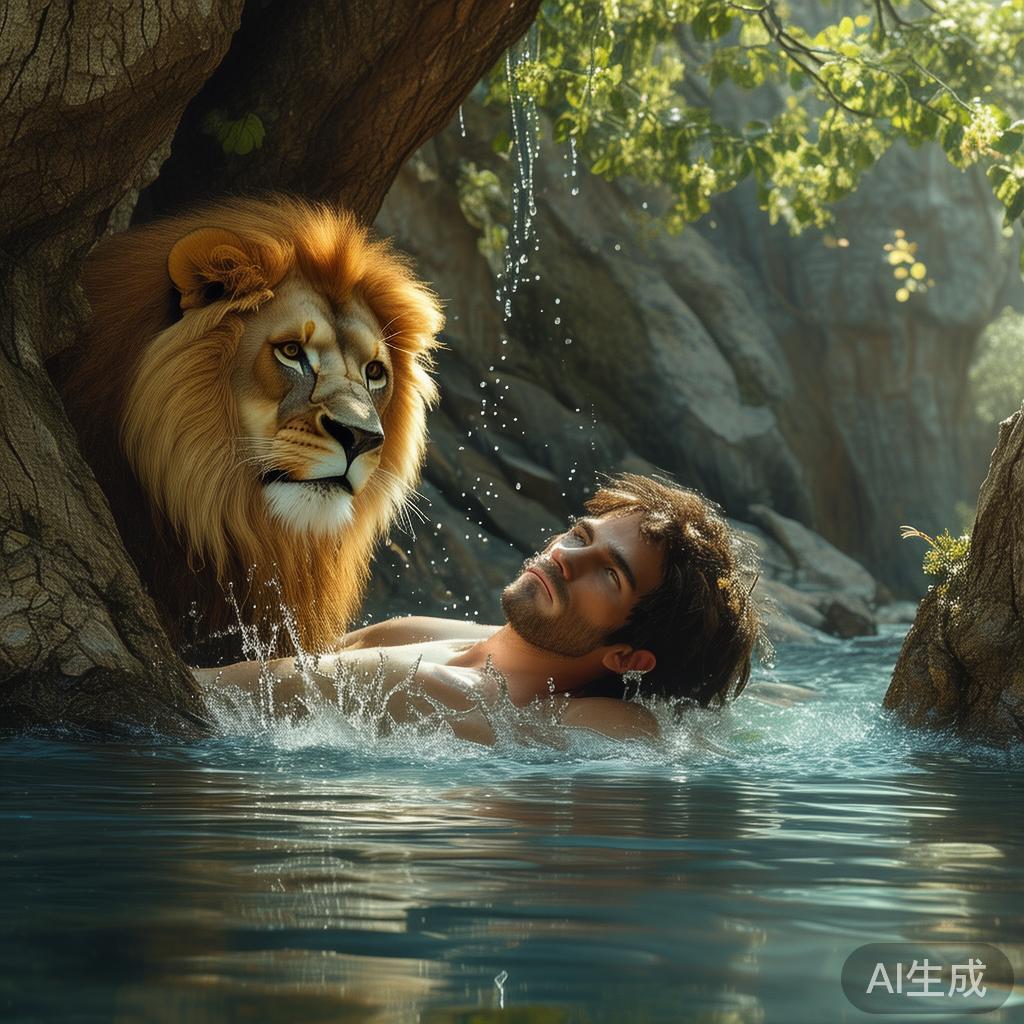 这忠诚的狮子随后又把王子从悬崖救了回来,带他来到一棵树下,树旁流淌着清澈的溪水。王子坐下休息的时候,那狮子轻轻趴下,用爪子拨弄水面,激起了水花洒落在王子的脸上。几滴水滑入王子的眼睛,他顿时能够模糊地辨认一些东西了。就在这时,他看到一只小鸟飞过,因撞上树干而受了伤,它便降落在水中,冲洗自己后抖翼飞翔,仿佛重获新生。受到启发的王子赶紧俯身跳入清泉里与水相拥,而他洗完之后,发现自己的视界比之前更明亮了。