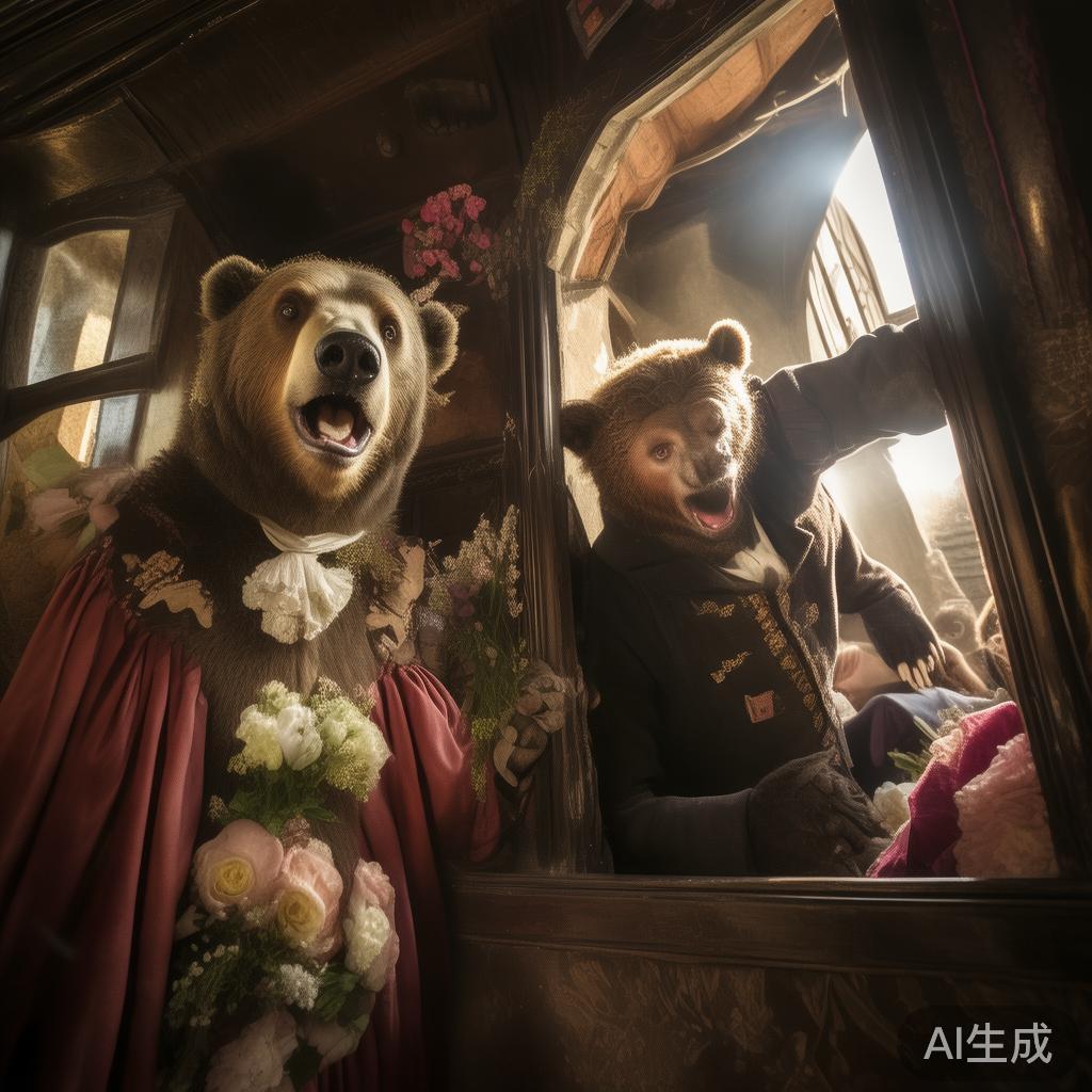 清晨阳光照耀进来,公主虽然显得心情愉快,却意外发现小裁缝竟安然无恙!她不得不履行诺言,于是国王派车送他们去教堂结婚。两位大裁缝眼睁睁看着这一切,懊恼不已,竟逞凶放出熊来。公主一声惊叫:“啊!熊在后面!”整个人都慌了。